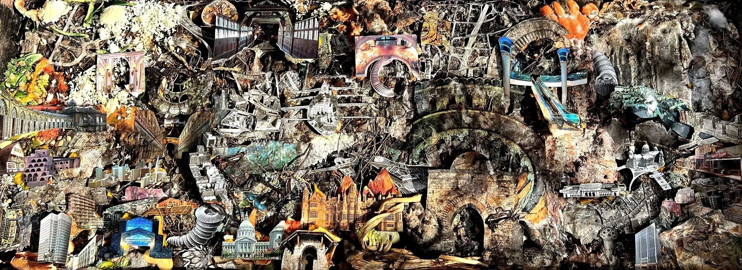 Bug City was a living collage composed of food scraps (compost material), intricate architectural cutouts, and the many organisms who processed this material to create compost. The project culminated in the planting of a garden within the collage. This garden was harvested and a salad made for the audience in a performance incorporating a six-channel video installation documenting the life cycle of the collage during the Lost Wilds Symposium, Berkeley, CA, April 2025.